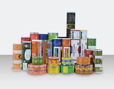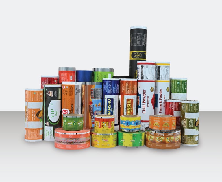 We offer to print up to 9 different colours through our rotogravure printing presses. These machines ensure premium print colour quality and long-lasting impressions. Printed Laminated rolls are often used in industries like Food & Beverages, Personal Care, Cosmetics, Pharmaceuticals, etc. To convert the roll form into a packed product, FFS machines are used to form, fill & seal the pouch at the customer’s end.